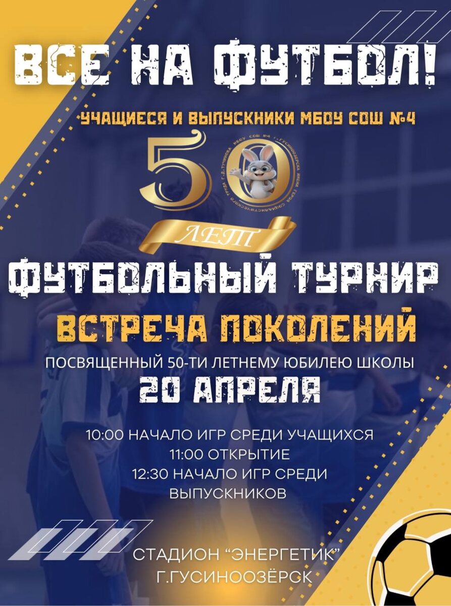 ⚽️ЮБИЛЕЙНЫЙ ФУТБОЛЬНЫЙ ТУРНИР 20 апреля на стадионе «Энергетик» пройдёт яркий и динамичный турнир по мини-футболу среди учащихся и выпускников школы №4! К участию приглашаются: 👟 Школьники (1–8 классы); 🎓 Выпускники прошлых лет. Собери свою команду! ⚡️ Придумай название; ⚡️ Возьми с собой болельщиков; ⚡️ Зарегистрируйся у организатора. Формат игры: 👥 Состав команды - 5 человек (4 игрока + 1 вратарь) ⏱️ Таймы: - для учащихся - 2×5 минут; - для выпускников - 2×10 минут. Регламент: 10:00 - старт матчей среди учащихся; 11:00 - торжественное открытие; 12:30 - игры среди выпускников. Конкурс болельщиков! 📣 Собери команду поддержки, прихвати плакаты, подготовь речёвки и прояви себя в борьбе за звание лучших болельщиков турнира! По всем вопросам обращаться: ✉️ @akinorevmai в Telegram или WhatsApp До встречи на стадионе! Будет жарко! 🫡Администрация Селенгинского района. Подписаться