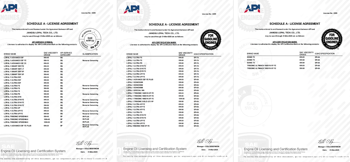 31 марта 2025 года вступил в силу новый стандарт моторных масел API SQ / ILSAC GF-7, устанавливающий дополнительные требования к смазочным материалам для бензиновых двигателей. Lopal подтвердил соответствие обновленным требованиям, пройдя сертификацию и тестирование своих масел. Компания получила сертификацию нового стандарта в первый же день его вступления в силу, что подтверждает высокий технологический уровень и готовность производителя к новым требованиям отрасли ГСМ. Это результат длительной подготовки, исследований и испытаний, позволяющий Lopal оставаться среди лидеров индустрии смазочных материалов. Сертификация API (American Petroleum Institute) определяет уровень эксплуатационных характеристик моторных масел. Новый стандарт API SQ вводит более строгие критерии защиты двигателя от преждевременного воспламенения LSPI (Low-Speed Pre-Ignition), износа поршневой группы и цепи ГРМ при низких температурах запуска. Стандарт предписывает высокие требования сохранения чистоты двигателя