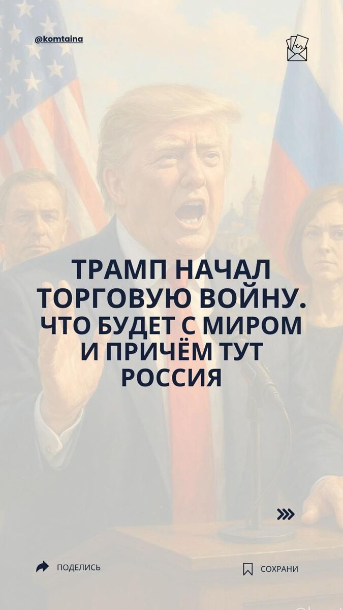 ⭐️ Трамп начал торговую войну. Что будет с миром и причём тут Россия Трамп не просто повысил пошлины. Он запустил волну, которая уже обрушилась на фондовые рынки, нефть, крипту, логистику и крупнейшие мировые бренды. 📉 S&P рухнул. Немцы, корейцы, японцы — под прицелом. 🇷🇺 Россия — в фокусе последствий, хоть и не в списках. Разбираем, зачем США это сделали, кто пострадает первым, и что это значит для бизнеса, рубля и ваших денег. 🔻 Это не просто пошлины. Это — начало новой экономической эпохи. Читайте полный разбор — и делитесь с коллегами. @komtaina 🔻НДС🔻ЗСК🔻СУР🔻