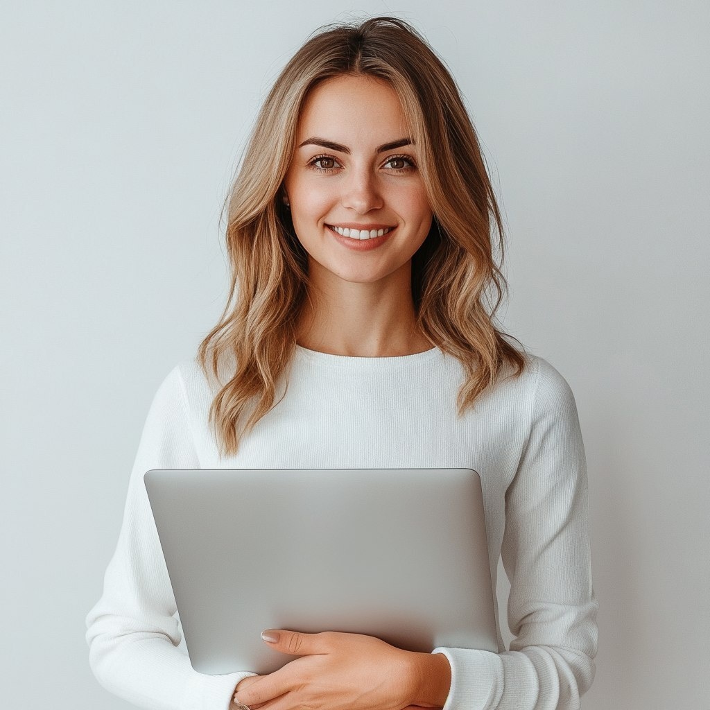 Создано на основе запроса: A realistic photo of 30y.o. ukrainian woman who is SMM manager, to the waist, smiling , wearing casual (black or white), holding the laptop, modern clean look, front view, bright lighting, no background, professional photography, shot on Canon EOS 5D, ultra-realistic --- Автоперевод: Реалистичная фотография 30y.O. Отлично получилось? 🤔 https://dzen.ru/id/65c0c65c86e4f837c27b24d7 #ИИ #AI #нейросеть #midjourney #art