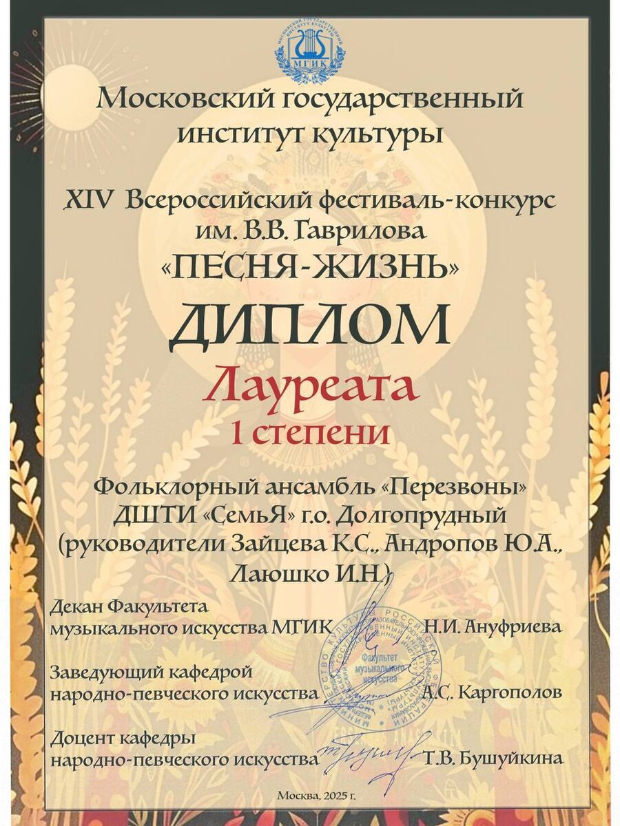 🥇 Новая награда в копилке группы «Перезвоны»! ✨Традиционно ребята принимают участие во Всероссийском фестивале-конкурсе им В.В. Гаврилова «Песня-жизнь», который проводит кафедра народно-певческого искусства Московского государственного института культуры. 💥10 апреля в гала-концерте фестиваля приняли участие лучшие народно-певческие коллективы России, среди которых группа «Партизан FM», ансамбль «Поверье», ансамбль народной музыки «Дмитровские рожечники» и многие другие коллективы. 💥Ансамбль «Перезвоны» стал обладателем диплома Лауреата I степени! Поздравляем ребят и педагогов! 💥 Педагоги группы: Зайцева К.С., Лаюшко И.Н., Андропов Ю.А. #дтшсемья #театральнаяшколасемья