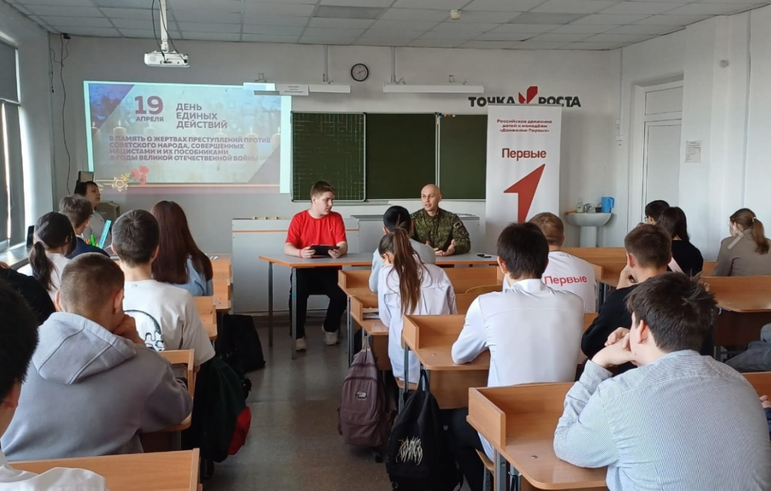 19 апреля – День памяти о геноциде советского народа нацистами и их пособниками в годы Великой Отечественной войны. Геноцид – форма массового насилия, действия, совершаемые с намерением уничтожить, полностью или частично, какую-либо национальную, этническую, расовую или религиозную группу как таковую. Геноцид – это преступление, у которого нет срока давности. Памятная дата – 19 апреля – напоминает нам об одной из самых важных страниц в истории нашей страны. О Великой Отечественной войне. Войне, которую нельзя забывать и память о которой так важно сохранять! В преддверии памятной даты Активисты Первичного отделения Движения Первых подготовили и провели “Классную встречу” для учеников 10-11 классов с Еранцевым Евгением Анатольевичем – специалистом регионального отделения Движения Первых по военно-патриотическому воспитанию. Евгений Анатольевич – ветеран боевых действий, участник чеченской войны, СВО, член правления Общероссийской общественной организации “РОССИЙСКИЙ СОЮЗ ВЕТЕРАНОВ АФГАНИ