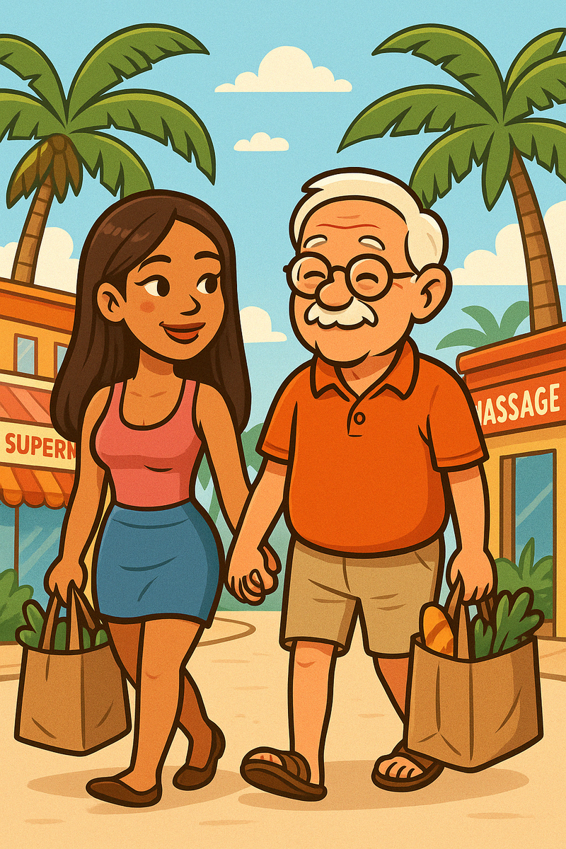 Русскоговорящие и европейские мужчины почтенного возраста обожают Таиланд. И дело не только в климате. Тут, среди пальм и массажных салонов, можно найти то, что на родине давно утекло с кровью молодости — ощущение, что ты ещё ого-го. Рядом — стройная тайка с бездонным терпением и парой авосьек в руках. Она — носильщик, переводчик, иногда даже жена. Он — завхоз старых мечт: устроил себе жизнь, где не он нужен, а ему угождают. Супермаркет — его охота. Массажный салон — его дворец. А девушка — символ того, что возраст, оказывается, можно просто обмануть... купюрой. Грустная экзотика? Или тропическая сказка на последнюю главу жизни? Судить сложно. Но выглядит это всё... забавно.