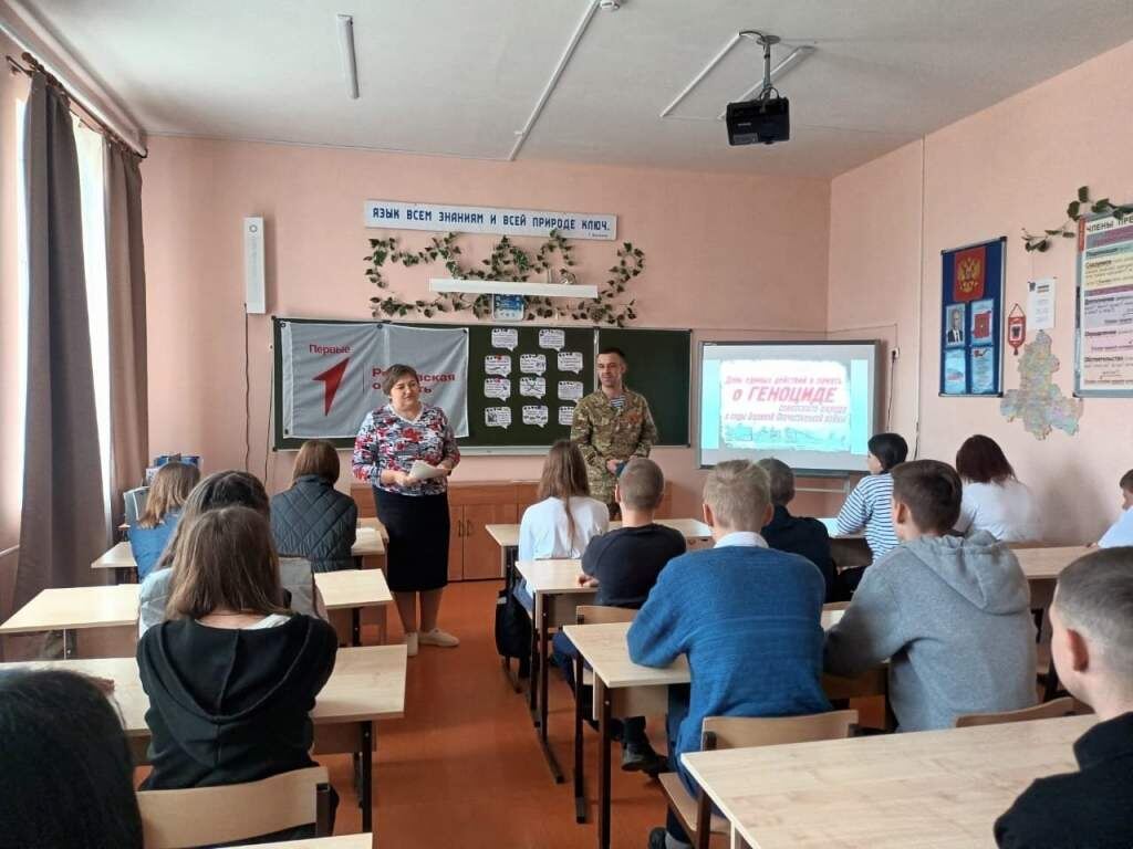 В Краснооктябрьской школе Веселовского района состоялась встреча с участником спецоперации, посвященная Дню памяти о геноциде советского народа в годы Великой Отечественной войны. Краснооктябрьская школа участвует в всероссийской акции «Поколения помнят», посвященная Дню памяти о геноциде советского народа в годы Великой Отечественной войны. В школе состоялась классная встреча активистов Движения Первых первичного отделения с участником СВО Александром Аксёненко, который рассказал о боевом пути, наградах и поделился своим опытом и знаниями. Также он акцентировал внимание на том, что спустя 80 лет нашей стране приходится вновь бороться с проявлениями геноцида, что является трагическим напоминанием о незаживающих ранах истории. Классные руководители С.В. Степанова и Л.М. Бабий рассказали участникам о зверствах фашистских захватчиков на оккупированных территориях, о планомерном истреблении мирного населения, о создании концлагерей и гетто, где тысячи людей были обречены на мучительную сме