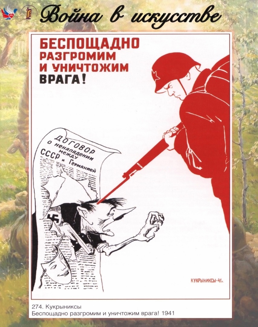 Институт гуманитарных наук и социальных технологий Костромского университета при участии патриотического клуба КГУ «Сердцем с Россией» продолжает проект «Война в искусстве» с участием студентов 1 курса. Слышали ли вы когда-нибудь о Кукрыниксах? Даже если этот псевдоним вам не знаком, будьте уверены, вы видели их работы. В период войны одним из средств поднятия боевого духа стали плакаты и карикатуры, количество которых с каждым годом росло. Именно тогда трудился творческий коллектив советских художников-графиков и живописцев под названием "Кукрыниксы". В него входили члены Академии Художеств СССР КУприянов, КРЫлов и НИКолай Соколов. Значимым моментом в творчестве коллектива стал военный плакат «Беспощадно разгромим и уничтожим врага!». Он появился на июньских улицах Москвы одним из первых — сразу же после нападения гитлеровской Германии на СССР. Кукрыниксы прошли всю войну: их листовки с карикатурами сопровождали советских солдат до Берлина. Основной посыл Кукрыниксов заключался в са