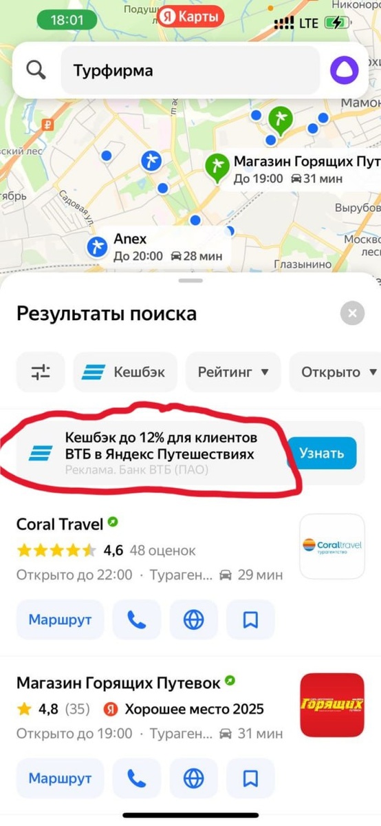 Турагенты в недоумении: многие вдруг обнаружили в карточках своих туркомпаний на Яндекс.Картах рекламу кешбэка 12% от банка ВТБ с