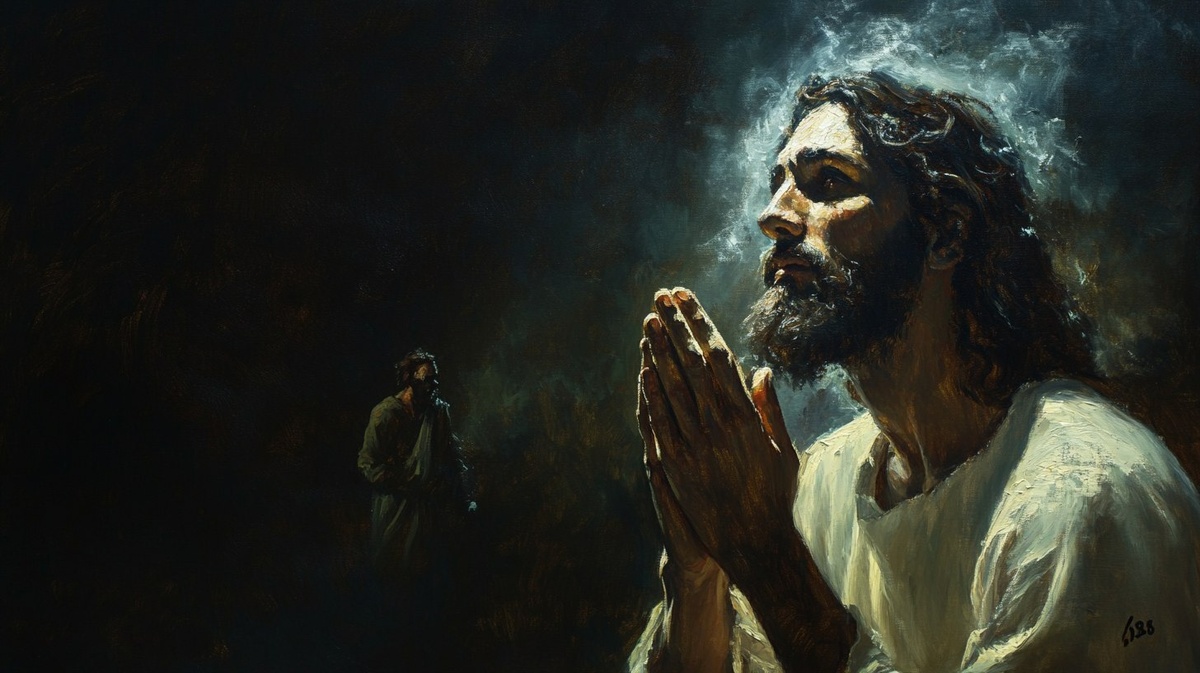 Создано на основе запроса: Oil painting, Jesus portrait, he is praying with hands clasped in concentration & powerfully, shining at his face. he is looking at camera. he is on the right side of the picture, taking up 1/3 of the picture. In behind is a man standing near, in wilderness, at dark night, magic light. in 200 BC. --- Автоперевод: Масляная живопись, Портрет Иисуса, он молится с руками, сложенными в концентрации и мощно, сияя на его лице. Хорошо выглядит? 🤔 https://dzen.ru/id/65c0c65c86e4f837c27b24d7 #ИИ #AI #нейросеть #midjourney #art