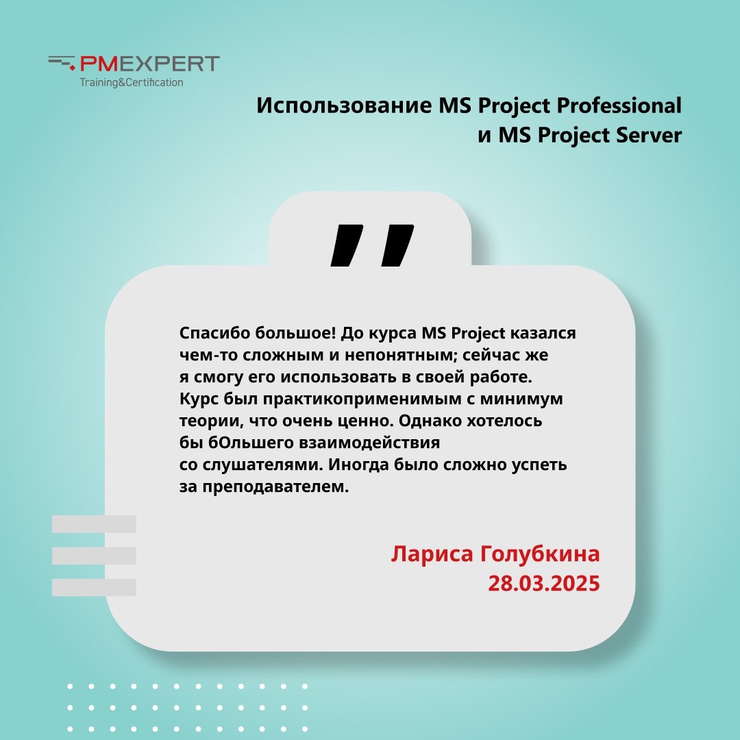Отзывы слушателей о курсе PM Expert "Использование MS Project Professional и MS Project Server" Слушатели прошли двухдневное обучение (16 академических часов), направленное на освоение инструментов Microsoft Project для эффективного управления проектами. Программа курса включает базовые функции MS Project, основы календарного и ресурсного планирования, групповую работу и практику отслеживания проектов. 80% курса составляют практические упражнения. Этот курс можно пройти в формате повышения квалификации с выдачей соответствующего удостоверения. 👨🏫 Тренер курса: Громов Валерий (Primavera P6 EPPM CIS, MCPS, MCNPS, MCTS, бизнес-тренер PM Expert) 🗓 Ближайшая дата проведения: 23-24 июня 2025 г. (онлайн формат) 📌Ознакомьтесь с полным расписанием курсов
