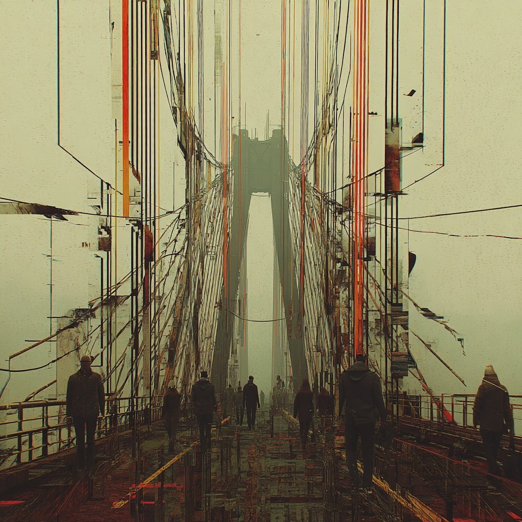 Создано на основе запроса: Cracked suspension bridge made of Feedtech cables and synthetic bone, illuminated by flickering ad glyphs, draped in worn prayer cloths and corrupted banners, people walking across glitch in their appearance, beneath the bridge fog pulses with color, architectural decay meets neural tech, digital ruin aesthetic --- Автоперевод: Треснутый подвесный мост, изготовленный из кабелей с питанием и синтетической кости, освещенный мерцающими глифами ad, драпированными изношенными молитвенными тканями и испорченными баннерами, люди, проходящие по сбоку в своем внешнем виде, под мостом -туманом пульсам с цветом, архитектурный распад встречается с нейральными технологиями, цифровые эстетические эстетические. Как тебе эта генерация? 🤔 https://dzen.ru/id/65c0c65c86e4f837c27b24d7 #ИИ #AI #нейросеть #midjourney #art