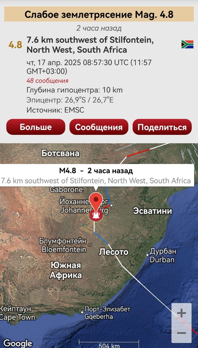 В ответ на пост Южная Африка через 8 дней после предупреждения выдала слабое, но ощутимое землетрясение. ==== South Africa received a weak but noticeable earthquake 8 days after the warning.