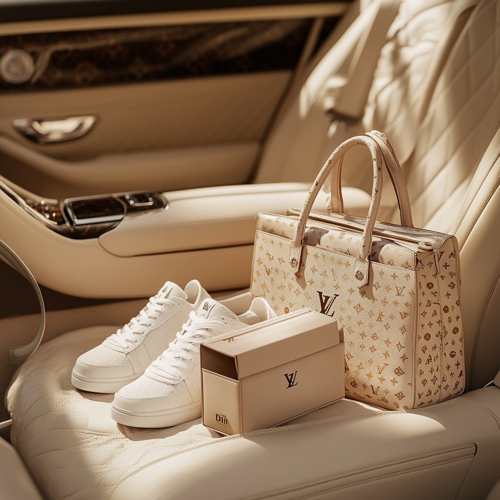 Создано на основе запроса: High-end fashion shopping scene in a luxury car. On the passenger seat, place a Louis Vuitton monogram handbag, a Dior shopping bag, a pair of white Dior sneakers, and a beige Louis Vuitton box. Cream leather car interior, visible armrest with cup holders, and a hint of a designer dashboard. Soft natural lighting, chic and opulent vibe. --- Автоперевод: Высококачественная сцена модных покупок в роскошном автомобиле. Как тебе такая генерация? 🤔 https://dzen.ru/id/65c0c65c86e4f837c27b24d7 #ИИ #AI #нейросеть #midjourney #art