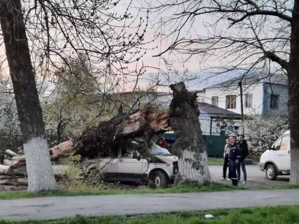 Огромное дерево упало на припаркованное авто в Ростовской области