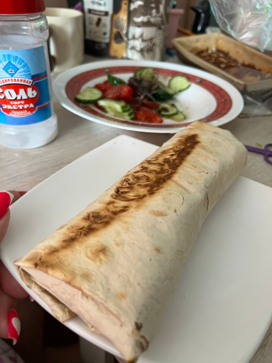 Приготовила утром Ну вернее сейчас Из рулета самодельного (из филе грудки) Овощи 🍅🥒🥬🧅(красный) Грибы(большой шамп чуть обжарила на сухой) Морковка корейская Сметана Сацебели Брынзы немного