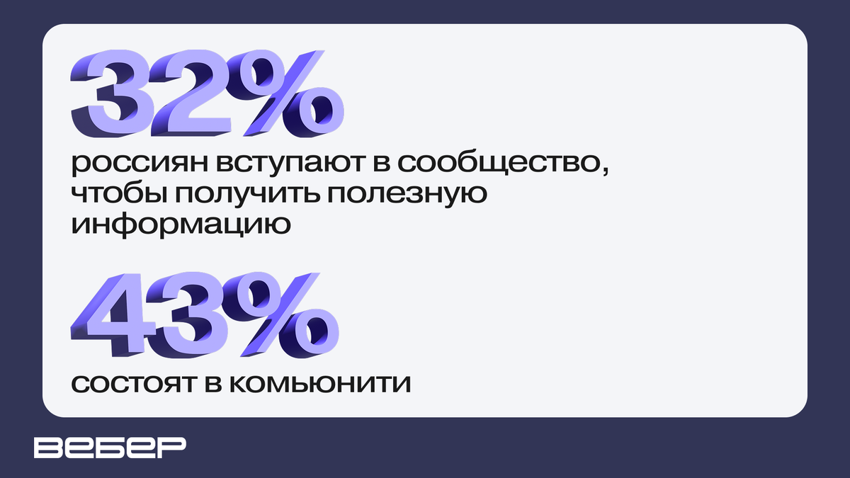Социологическое агентство Вебер провело исследование и выделило ключевые инсайты для предпринимателей, топ-менеджеров и маркетологов. Сообщества перестали быть просто площадками для общения — теперь это мощный инструмент влияния, источник лояльности и драйвер роста бизнеса. 1. Люди ищут пользу, а не развлечение 🔹 32% участников приходят за уникальной информацией 🔹 20% — за связями с единомышленниками 🔹 18% — за обучением и экспертизой Что это может значить для бизнеса? При построении бренда, корпоративного сообщества или продвижении продукта стоит обратить внимание на работу с ценностью. Образовательные программы, обмен опытом и практическая польза могут способствовать повышению вовлечённости и формированию лояльной аудитории. 2. Гибридные комьюнити — золотая середина 🔺 Четверть россиян выбирают гибридный формат (онлайн-платформа + офлайн-встречи). 🔺 Только 12% предпочитают чисто офлайн, 19% — онлайн Как можно адаптировать? Совмещение digital-взаимодействия с офлайн-мероприятиями