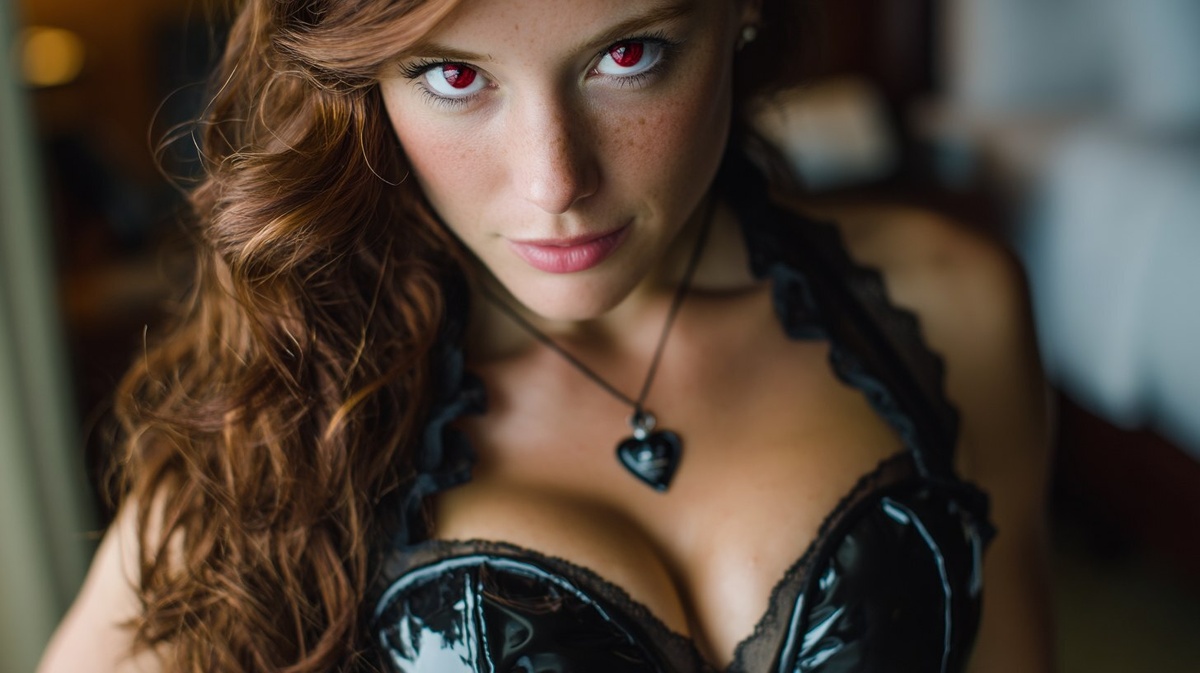 Создано на основе запроса: Redhead woman, black latex bodysuit, black lipstick, small black heart necklace, red eyes