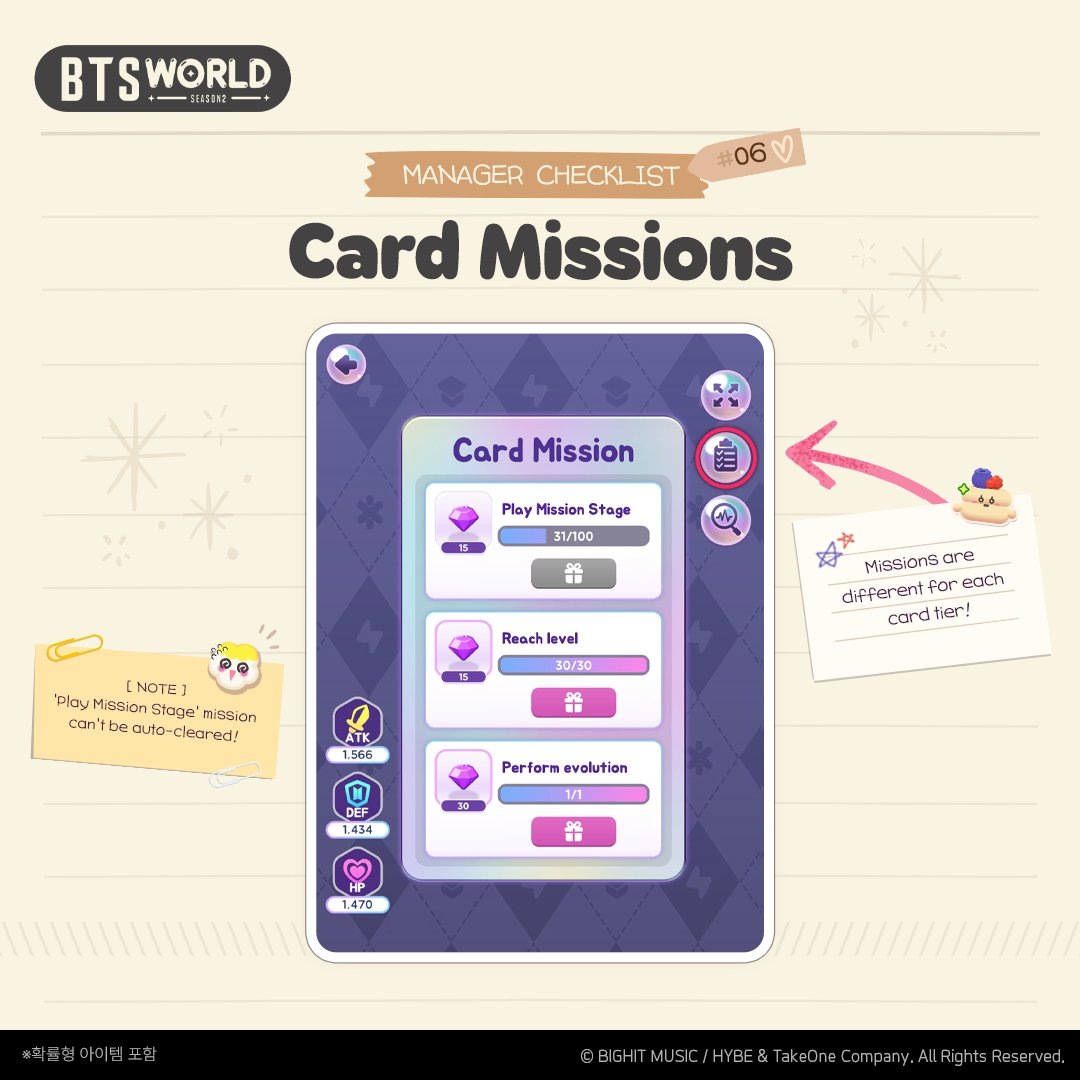 🍊 BTS World Season 2 в X: ✔️ Чек-лист менеджера 06 Нажмите на значок рядом с карточкой, чтобы увидеть задание карточки. Выполните задание и получите награду, Менеджер 🎁 ⚠ Обратите внимание, что выполнить задание с помощью функции автоматического завершения невозможно! 🎮 Скачать игру #BTSWorld 🐈🌱[https://dzen.ru/id/5f3ce54ccaeef80d2efd6e05]🌱🐈