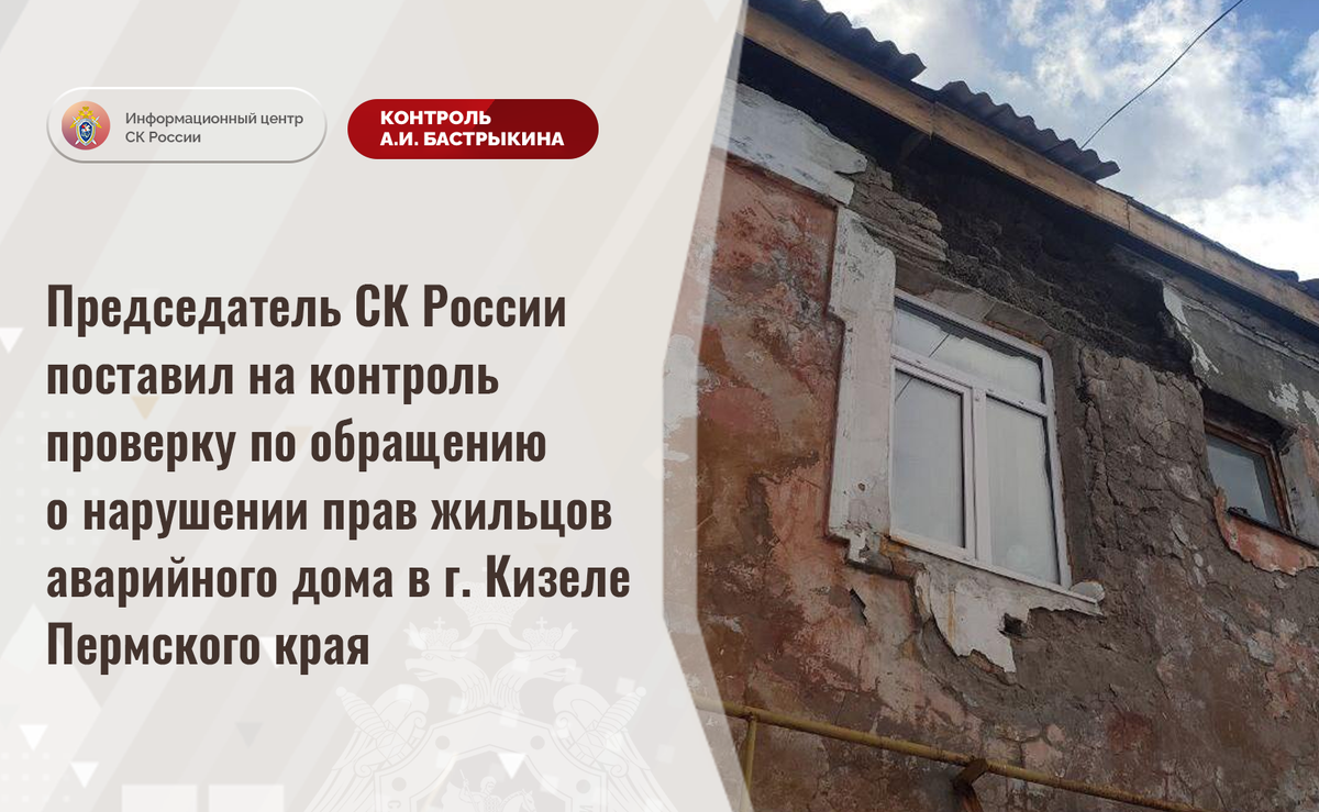 Председатель СК России поставил на контроль проверку по обращению о нарушении прав жильцов аварийного дома в г. Кизеле Пермского края В приемную Председателя СК России А.И. Бастрыкина «ВКонтакте» обратилась жительница города Кизела Пермского края по вопросу нарушения прав жильцов многоквартирного дома по улице Пролетарской. Здание, 1940 года постройки, находится в непригодном состоянии: конструкции разрушаются, на стенах образовались глубокие трещины, потолочные перекрытия частично обвалились, в жилых помещениях появились сырость и плесень, горячее водоснабжение отсутствует. В связи со значительным физическим износом в 2021 году строение признано аварийным, однако до настоящего времени благоустроенное жилье гражданам не предоставлено, расселение планируется в срок до 2030 года. Многочисленные обращения жильцов, опасающихся обрушения дома, в уполномоченные органы результатов не принесли. В СУ СК России по Пермскому краю по поступившему обращению организована процессуальная проверка. Пр
