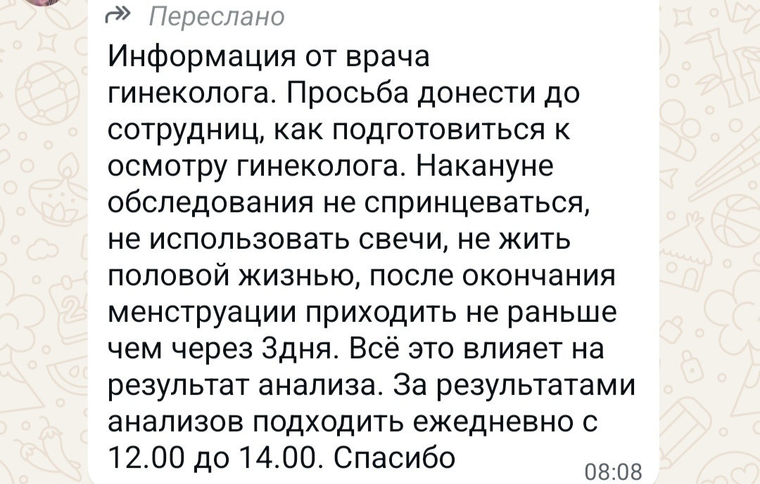 Здравствуйте🤝 У нас же полным ходом идет ежегодный медосмотр. Мне еще осмотр женского доктора предстоит. Боюсь я его чуть меньше стоматолога, хотя, кого я обманываю , одинаково боюсь. Нет , мне в кресле не больно, просто страшно, а как вы знаете, страх иррационален и не имеет объяснения. В этом году у нас новый гинеколог. Молодая , но , посетившие ее хвалят. Говорят, что очень внимательная, не грубая. Я еще и убедилась , когда разослали по нашим внутрибольничным группам в ватсапе сообщение от нее, больше напоминающем инструкцию , вроде подготовки к обследованию: Ну , молодец же! Так что:"Клянемся не бриться , не пить , курить , и остаться дикарями!" А вернее , подготовиться правильно) В прошлом году тоже хорошая гинеколог нас осматривала, но , я вообще попала в последний день осмотра, гинеколог сказала , что сегодня ее последний рабочий день. Уволилась она . Вспоминаю осмотр в прошлом году, делюсь приколом) Подготовилась я , как на свидание. Взгромоздилась на кресло , естественно , с