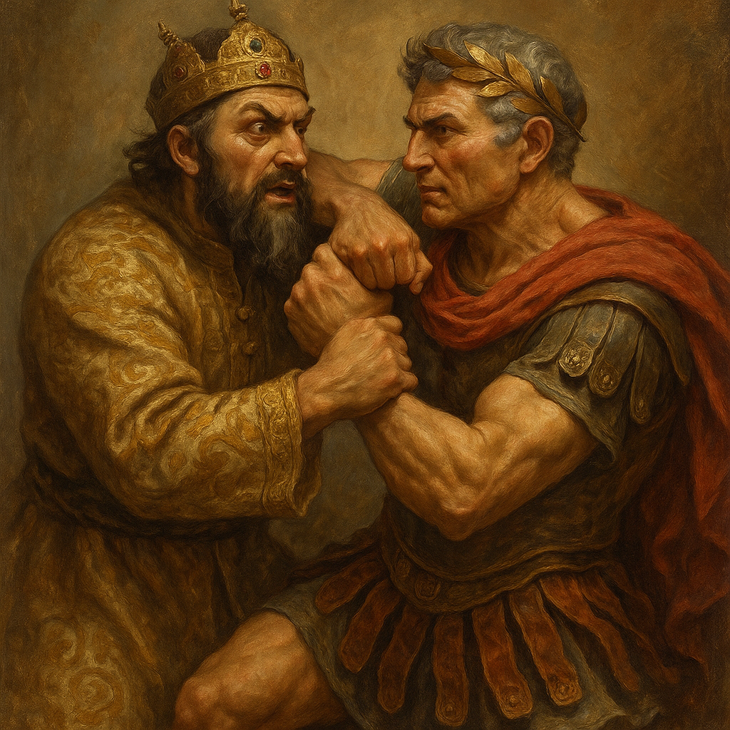 Иван IV Грозный, первый русский царь, чья жестокость и воинская доблесть сделали его легендой, и Гай Юлий Цезарь, римский полководец и диктатор, чьи завоевания изменили античный мир. Один — символ московской мощи XVI века, другой — икона римской стратегии I века до н.э. Что, если эти два титана, разделённые веками, сошлись бы в рукопашной схватке? Смог бы Иван Грозный, с его царской яростью и физической силой, разнести Цезаря, чья военная выучка и хладнокровие прославили его в веках?