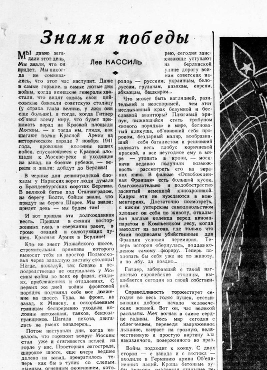 Завтра мы узнаем подробности боев в германской столице. C радостным волнением прочтем сообщение о подробностях штурма, о деталях битвы. Но сегодня, салютуя, радуясь, поздравляя друг друга, мы уже знаем: знамя победы водружено над Берлином.