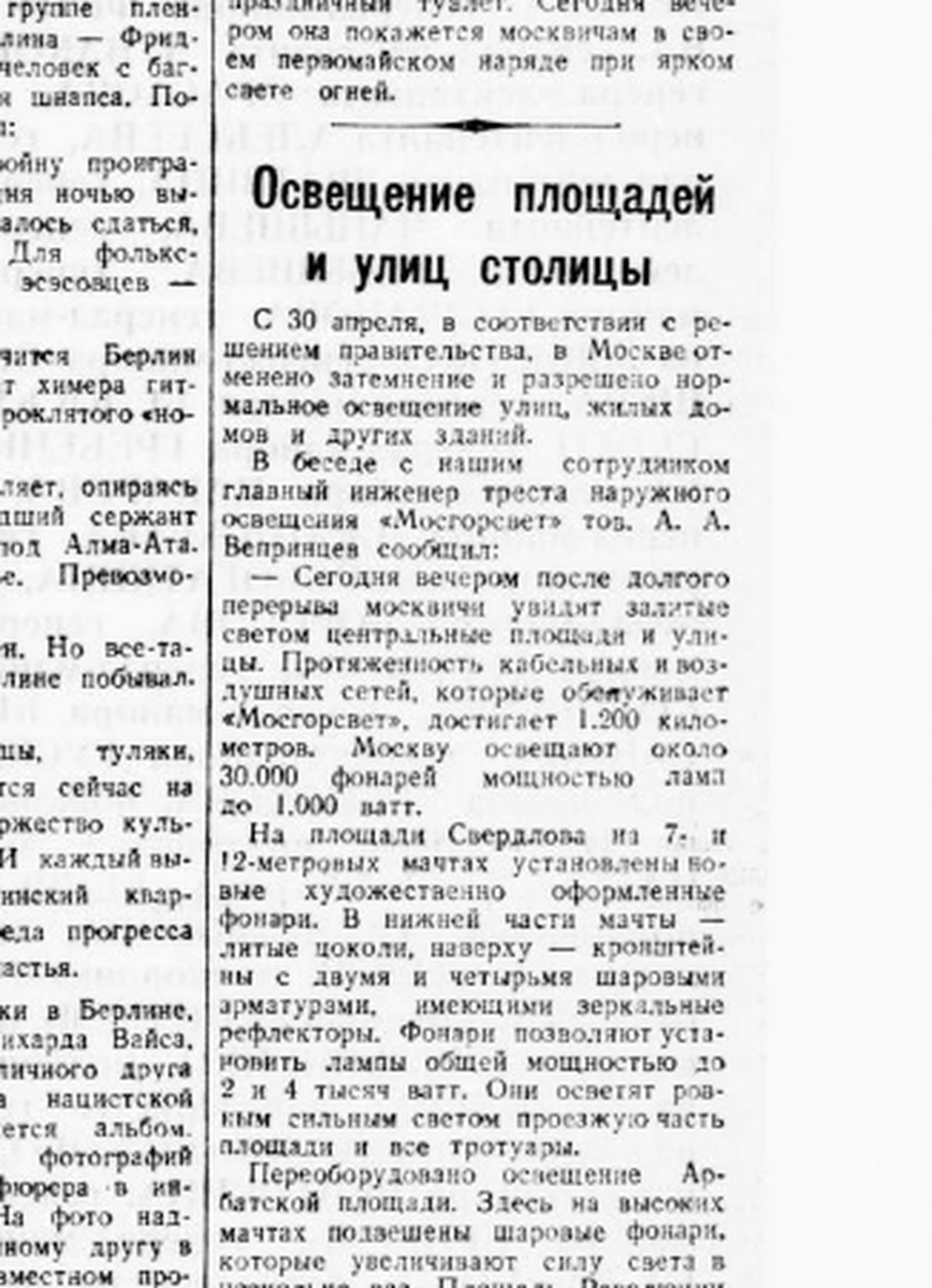 С 30 апреля, в соответствии с решением правительства, в Москве отменено затемнение и разрешено нормальное освещение улиц, жилых домов и других зданий. В беседе с нашим сотрудником главный инженер треста наружного освещения «Мосгорсвет» тов. А. А. Вепринцев сообщил: — Сегодня вечером после долгого перерыва москвичи увидят залитые светом центральные площади и улицы. Протяженность кабельных и воздушных сетей, которые обслуживает «Мосгорсвет», достигает 1200 километров. Москву освещают около 30 000 фонарей мощностью ламп до 1000 ватт. На площади Свердлова на 7- и 12-метровых мачтах установлены художественно оформленные фонари. В нижней части мачты — литые цоколи, наверху — кронштейны с двумя и четырьмя шаровыми арматурами, имеющими зеркальные рефлекторы. Фонари позволяют установить лампы общей мощностью до 2 и 4 тысяч ватт. Они осветят ровным сильным светом проезжую часть площади и все тротуары. Переоборудовано освещение Aрбатской площади. Здесь на высоких мачтах подвешены шаровые фонари,