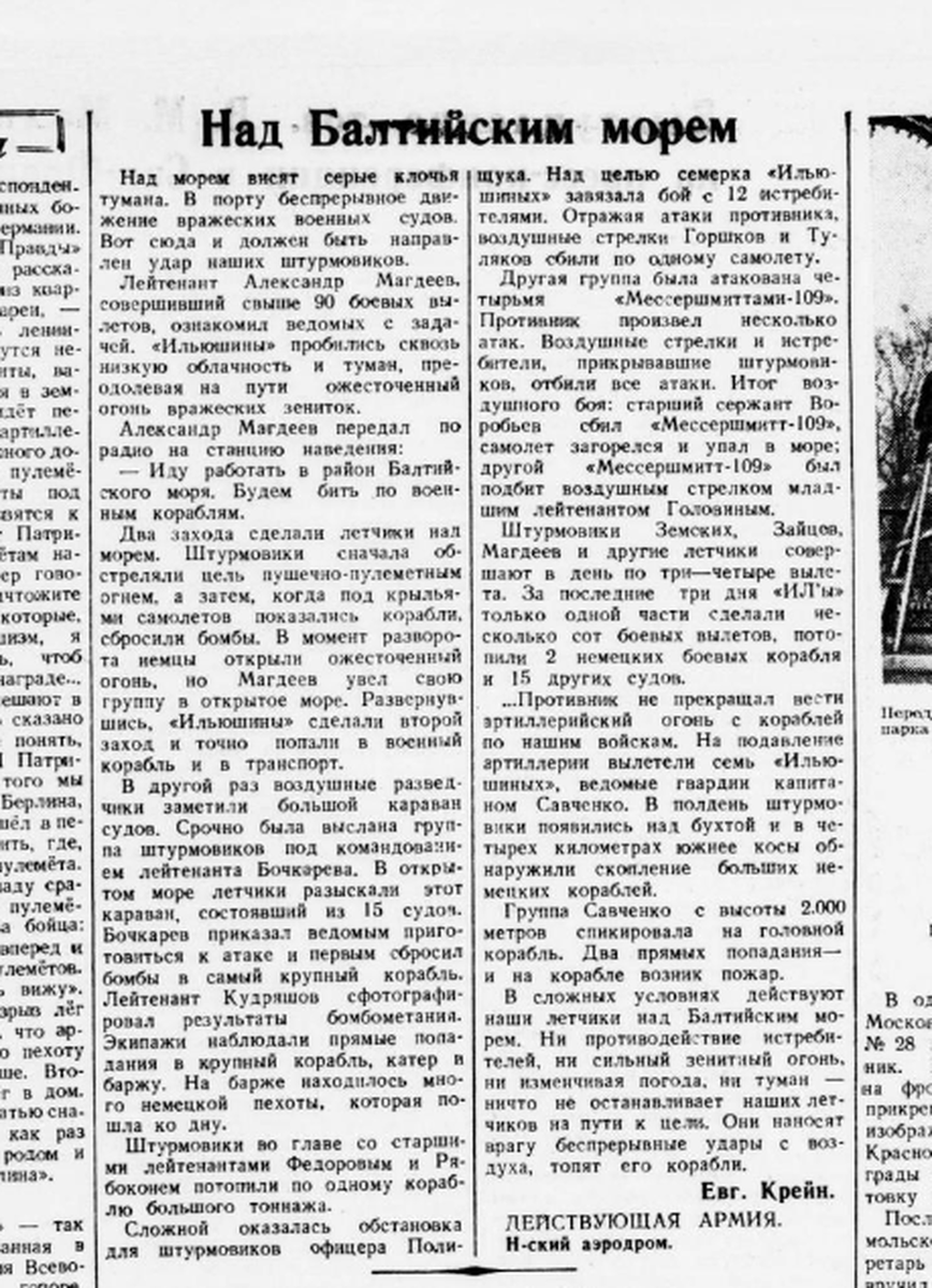 Над морем висят серые клочья тумана. В порту беспрерывное движение вражеских военных судов. Вот сюда и должен быть направлен удар наших штурмовиков. Лейтенант Александр Магдеев, совершивший свыше 90 боевых вылетов, ознакомил ведомых с задачей. «Ильюшины» пробились сквозь низкую облачность и туман, преодолевая на пути ожесточенный огонь вражеских зениток. Александр Магдеев передал по радио на станцию наведения: — Иду работать в район Балтийского моря. Будем бить по военным кораблям. Два захода сделали летчики над морем. Штурмовики сначала обстреляли цель пушечно-пулеметным огнем, а затем, когда под крыльями самолетов показались корабли, сбросили бомбы. В момент разворота немцы открыли ожесточенный огонь, но Магдеев увел свою группу в открытое море. Развернувшись, «Ильюшины» сделали второй заход и точно попали в военный корабль и в транспорт. В другой раз воздушные разведчики заметили большой караван судов. Срочно была выслана группа штурмовиков под командованием лейтенанта Бочкарева. В