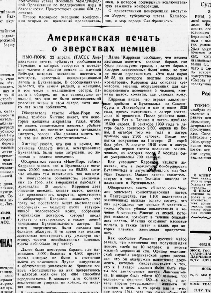 Нью-Йорк, 22 апреля. (ТАСС). Американская печать публикует сообщения из Германии, в которых говорится о поведении тысячи с лишним немцев — жителей Веймара, которых заставили посетить и осмотреть известный концентрационный лагерь в Бухенвальде. В сообщениях указывается, что немцы рыдали, а женщины, в том числе и медицинские сестры, падали в обморок, но все единодушно заявляли, что они не были осведомлены об условиях жизни в этом лагере, хотя много лет жили поблизости. Обозреватель газеты «Нью-Йорк геральд трибюн» Хиггинс пишет, что некоторые женщины закрывали глаза, чтобы не видеть свидетельств массовых убийств и садизма, но военные власти заставляли смотреть, говоря: «Вы должны видеть то, за что вы несете ответственность». Хиггинс указал, что как и немцы, посетившие Ордруф, немцы, осматривавшие Бухенвальд, были явно потрясены, но заявляли о полном неведении. Обозреватель газеты «Нью-Йорк таймс» Карривэн заявил, что в Бухенвальде осталось 20 000 заключенных из 80 000, которые обычно там