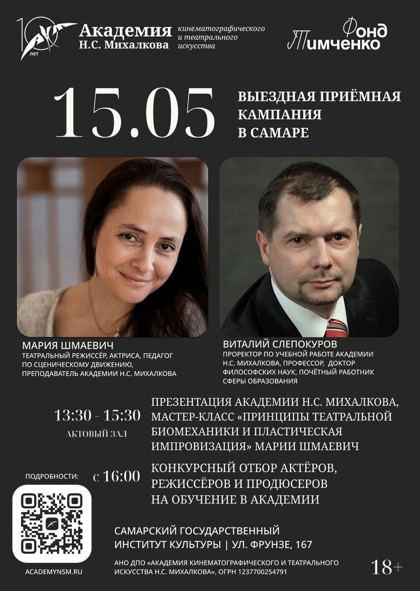 Выездная приёмная комиссия Академии посетит Самару⚡ 15 мая в СГИК будет работать выездная приемная комиссия Академии Н.С. Михалкова. Приглашаем начинающих актёров, режиссёров и продюсеров пройти отбор на возможность бесплатного годичного обучения в Академии, а также посетить открытый мастер-класс театрального режиссера Марии Шмаевич. Расписание мероприятий: 📆 15 мая ⏰ 13:30-14:00 – презентация Академии Н.С. Михалкова. ⏰ 14:00-15:30 – мастер-класс театрального режиссера Марии Шмаевич «Принципы театральной биомеханики и пластическая импровизация» для актёров. РЕГИСТРАЦИЯ ⏰ c 16:00 – конкурсный отбор актёров, режиссёров и продюсеров на бесплатное обучение в Академии. ЗАПИСЬ НА ОТБОР 📍СГИК | ул. Фрунзе, 167