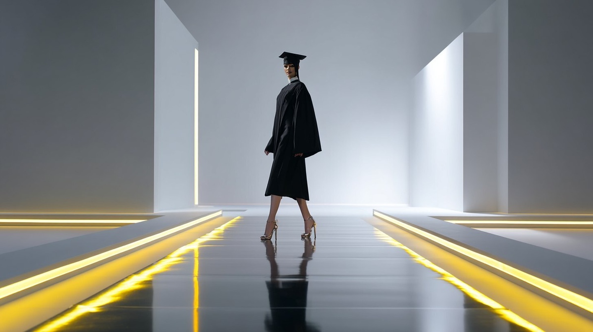Создано на основе запроса: A female model walking confidently on a glossy black acrylic runway with soft yellow LED strip lights built into the sides, side lighting along the inner edge of the raised side walls. She is wearing a black graduation gown and cap, high heels, and has an elegant posture. Modern minimalistic fashion show stage design, clean white background, photorealistic lighting, cinematic look --- Автоперевод: Женская модель, которая уверенно ходит по глянцевой черной акриловой взлетно -посадочной полосе с мягкими желтыми светодиодными огнями, встроенными в боковые стороны, боковое освещение вдоль внутреннего края поднятых боковых стен. Как тебе этот вариант? 🤔 https://dzen.ru/id/65c0c65c86e4f837c27b24d7 #ИИ #AI #нейросеть #midjourney #art
