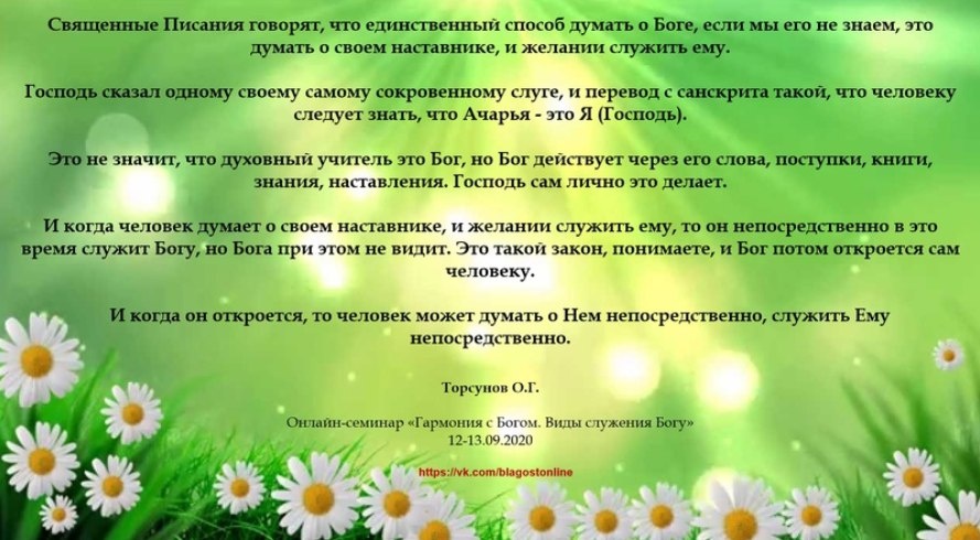 Священные Писания говорят, что ЕДИНСТВЕННЫЙ СПОСОБ ДУМАТЬ О БОГЕ, если мы его не знаем, это думать о своем наставнике, и желании служить ему. Господь сказал одному своему самому сокровенному слуге, и перевод с санскрита такой, что человеку следует знать, что Ачарья - это Я (Господь). Это не значит, что духовный учитель это Бог, но Бог действует через его слова, поступки, книги, знания, наставления. Господь сам лично это делает. И когда человек думает о своем наставнике, и желании служить ему, то он непосредственно в это время служит Богу, но Бога при этом не видит. Это такой закон, понимаете, и Бог потом откроется сам человеку. И когда он откроется, то человек может думать о Нем непосредственно, служить Ему непосредственно.