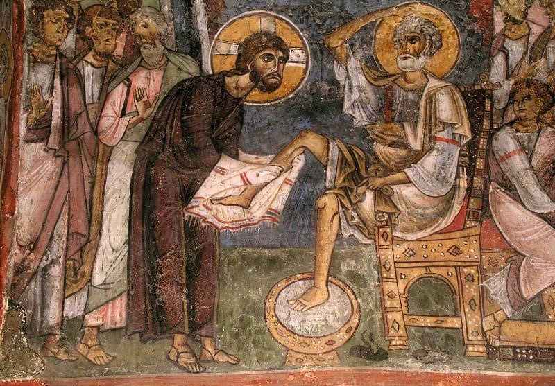 Первая часть тропаря напоминает нам о том, как Христос, показывая пример истинного первенства, омывает ноги своим ученикам:
