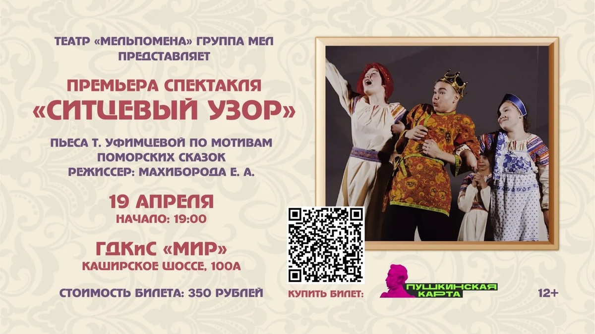 ✨ 🎭 Театр «Мельпомена» группа МЕЛ приглашает на спектакль! ✨ Это постановка по пьесе Татьяны Уфимцевой, созданная по мотивам поморских сказок. Режиссёр: Махиборода Е. А. 🚫 Возраст: 12+ 📆 19.04.2025🕒19:00 🏢 Дворец культуры и спорта «Мир» 📍 г. Домодедово, Каширское шоссе, д.100А 💰 Цена: 350 ₽ 🎫 Купить билет: https://iframeab-pre5158.intickets.ru/event/55129905/ ✅ Мероприятия Домодедово https://dzen.ru/id/66f10385cc4c5a16f7b5fb02 http://vk.com/domodedovo_events http://dzen.ru/domodedovo_events