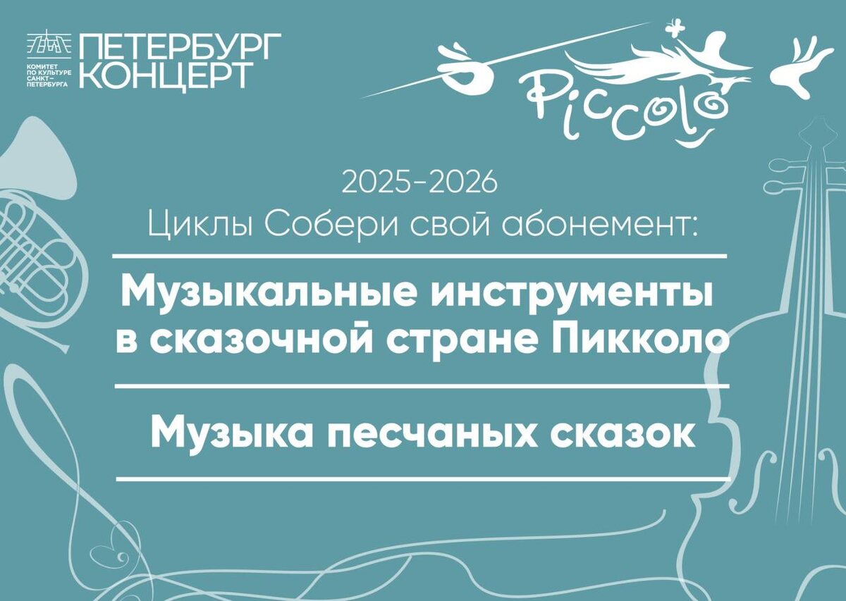 В новом сезоне мы приготовили для Вас не только абонементы, но и два цикла детских программ, из которых Вы сможете собрать абонемент на свой вкус! Цикл интерактивных концертов-занятий «Музыкальные инструменты в сказочной стране «Пикколо»* пройдет в камерной обстановке Зеркального зала Дома Кочневой. В легкой, игровой форме дети знакомятся с устройством музыкальных инструментов и их секретами, слушают фрагменты эталонных произведений классической музыки. Маленькие зрители выходят на сцену вместе с музыкантами оркестра Мариинского театра, танцуют и имеют возможность подойти к каждому из инструментов и попробовать на нём поиграть после спектакля. Цикл музыкальных интерактивных сказочных спектаклей «Музыка песчаных сказок»* сочетают живое музыкальное исполнение, актерское чтение и живопись песком. Основа детских спектаклей — увлекательные сюжеты, знакомые нам по произведениям Пушкина, Гофмана, Экзюпери, Метерлинка, Шарля Перро, или авторские сценарии Ольги Пикколо. Художник песочной аним