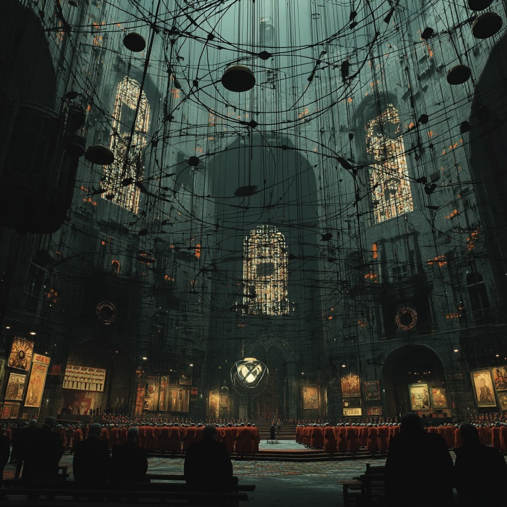 Создано на основе запроса: Dark cathedral-like chamber with glowing AR sigils circling overhead, Synod officials in crimson robes seated in tiers, center dais with a hovering glyph orb, stained glass windows flickering between propaganda and sacred symbols, cold blue ambient light, ritualistic and imposing, cyber-religious architecture, wide cinematic framing --- Автоперевод: Темная соборная камера со светящимися сигилами, кружающими над головой, чиновники синода в малиновых одеждах, сидящих в уровнях, центральным возвышенным с парящим глифным шариком, витражами, мерцающими между пропагандой и священными символами, холодным синим светом, ритуалистическим и внушительным, кибер-религиозны Неплохо вышло? 🤔 https://dzen.ru/id/65c0c65c86e4f837c27b24d7 #ИИ #AI #нейросеть #midjourney #art