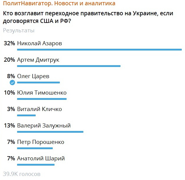 Наибольшие шансы возглавить переходное правительство Украины (которое будет сформировано в случае успешных переговоров России и США) – у Николая Азарова, который уже занимал должность главы Кабмина в 2010-14 годах, а с недавних пор вернулся в активную политику уже в статусе сопредседателя «Клуба народного единства». Таковы результаты опроса читателей «ПолитНавигатора», проведенного накануне на Telegram-канале издания. За Азарова высказались 32% респондентов. Голосование продолжалось четверо суток, в общей сложности в нем приняло участие около 40 тысяч человек. Из них 45% – это жители России, 55% – других стран (20% – Украина, остальные – государства, где много украинских беженцев – Польша, Белоруссия, Австрия, Германия, Англия, США и т.д.). Популярность Азарова объясняется тем, что спустя десятилетие войны и разрухи жизнь до Майдана кажется образцом стабильности и материального благополучия. С этим неразрывно связано имя тогдашнего главы Кабмина, и надежды на его возвращение в украинск