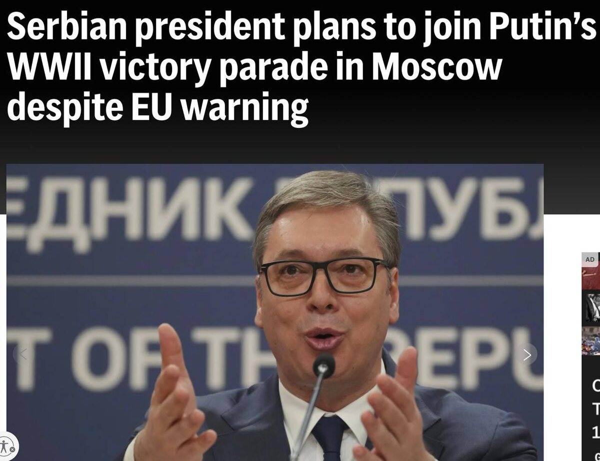 Президент Сербии Вучич заявил, что все равно поедет на 9 мая в Москву, несмотря на требование Евросоюза не делать этого, если он еще рассчитывает на вступление в блок «В предстоящий период мы будем находиться под давлением в связи с мероприятием в Москве, в котором мы объявили о своем участии», — заявил Вучич журналистам и отметил, что Сербия также примет участие в «совместной» организации парада. 👊 НАСОНОВ 🔴