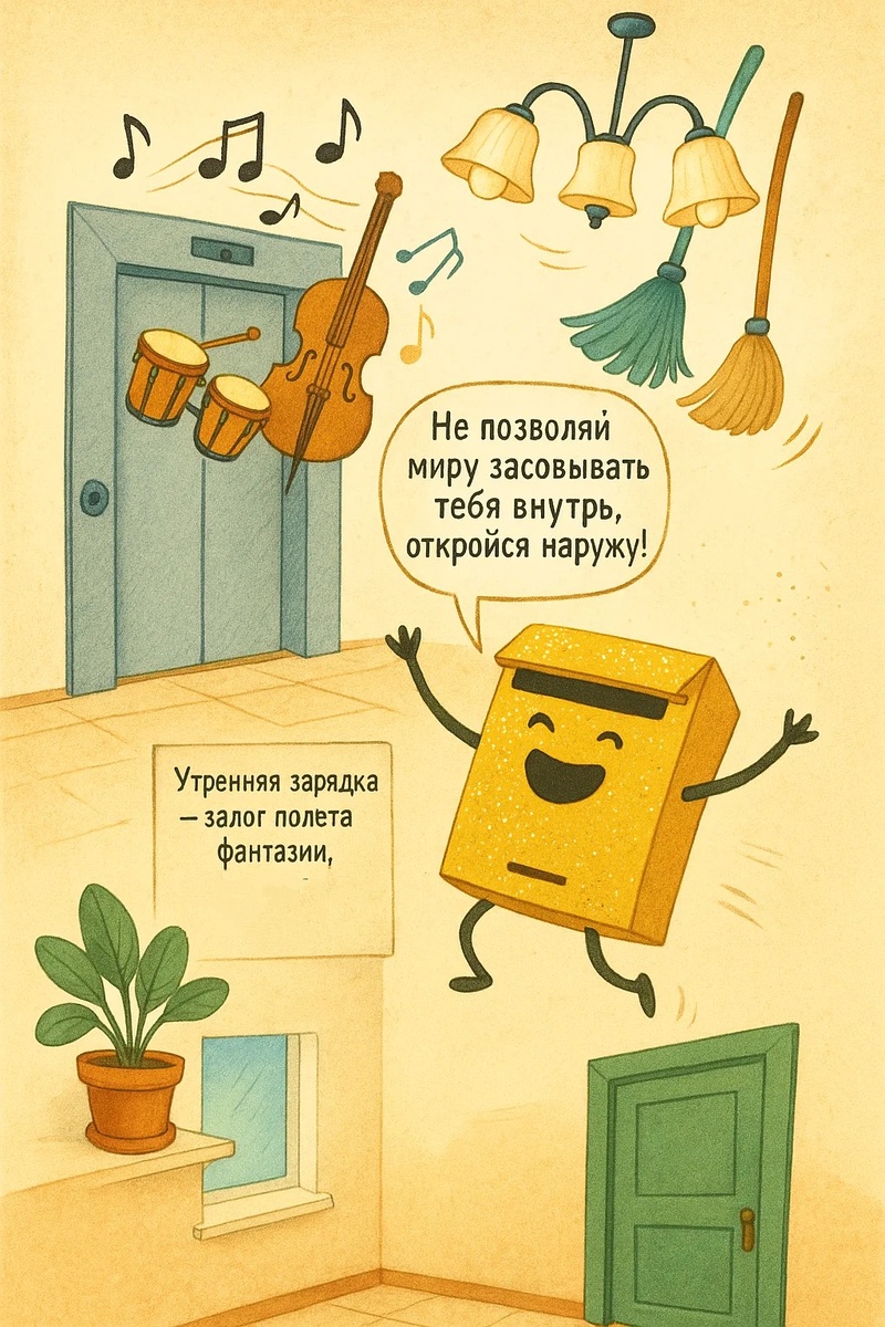 В одном подъезде, где каждое утро было похоже на джазовую импровизацию на кастрюлях, лифт устраивал шоу под названием «Угадай, на каком этаже ты проснулся». Он будил жильцов звуками бонго и бас-гитары, которые сам же и исполнял с помощью дверей и кнопки вызова. А тем временем почтовый ящик, покрывшийся золотыми блёстками и амбициями, снимал мотивационный ролик «От конверта до сцены», в котором декламировал: — Не позволяй миру засовывать тебя внутрь, откройся наружу! Бузяка проснулся вверх ногами. Это было его нормальное состояние с тех пор, как он перепутал кровать с гамаком, а гравитацию — с лягушкой. — Что за день? — спросил он потолок. — Зарядочный! — ответила люстра. Она тоже не спала, ведь училась танцевать ча-ча-ча с веником. Кутяпка уже прыгала на подушке, пытаясь завязать свои уши в узел восьмёркой. — Нам нужна зарядка! — кричала она. — Без утренней зарядки мозги начинают думать, что они омары! — УТРОЕННЫЙ ТАНЦЕВАЛЬНЫЙ МАРАФОН ЗАРЯДОЧНОГО ЭФФЕКТА начинается! —