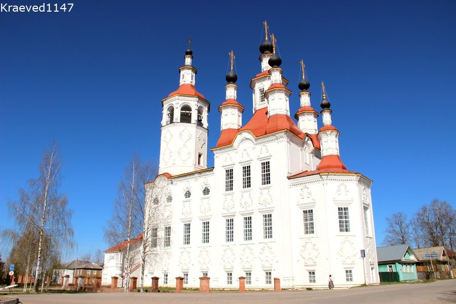 В конце XVIII века в Тотьме (Вологодская область) появились совершенно удивительные храмы - высокие, двусветные а часто - двухэтажные, с замысловатыми наличниками и лепными украшениями фасада, гранёными барабанами и высокими крыльцами. Направление в архитектуре так и назвали "тотемское барокко". Тотемский двухэтажный храм-корабль Входа Господня в Иерусалим построен единым вытянутым в длину комплексом с притвором, колокольней, трапезной и собственно церковью. Если смотреть сбоку, то сооружение действительно напоминает корабль. Шестиглавие храма образуется за счёт дополнительной главки над алтарём. Барабаны декоративные, лишь центральный - световой. По объёму храм не велик, свод сомкнутый, опор внутри нет, свод лежит на стенах. Церковь не действует. Внутри расположен краеведческий музей. Второй этаж летний, изукрашен барочными завитками-волютами-люкарнами. Но живопись в ужасающем состоянии. Пускают на колокольню, откуда открываются духоподъёмные виды. На колокольне Входоиерусалимского