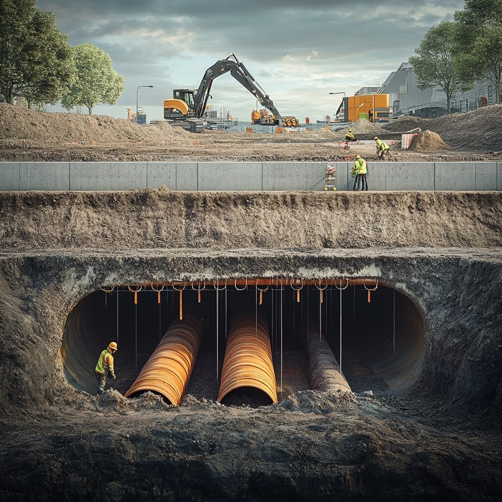 Создано на основе запроса: Cross-section view of an underground drainage system, large PVC or HDPE pipes laid underground, showing layers of