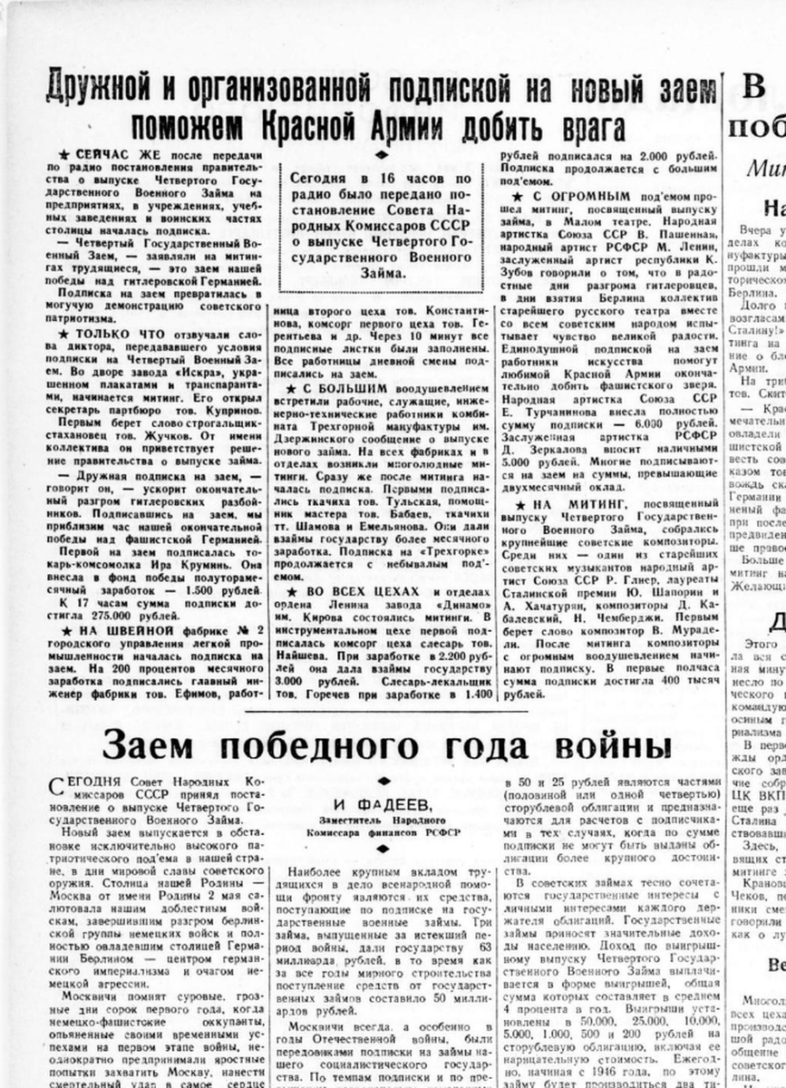 Сегодня в 16 часов по радио было передано постановление Совета Народных Комиссаров СССР о выпуске Четвертого государственного военного займа. СЕЙЧАС ЖЕ после передачи по радио постановления правительства о выпуске Четвертого государственного военного займа на предприятиях, в учреждениях, учебных заведениях и воинских частях столицы началась подписка. — Четвертый государственный военный заем, — заявляли на митингах трудящиеся, — это заем нашей победы над гитлеровской Германией. Подписка на заем превратилась в могучую демонстрацию советского патриотизма. ТОЛЬКО ЧТО отзвучали слова диктора, передававшего условия подписки на Четвертый военный заем. Во дворе завода «Искра», украшенном плакатами и транспарантами, начинается митинг. Его открыл секретарь партбюро тов. Куприянов. Первым берет слово строгальщик-стахановец, тов. Жучков. От имени коллектива он приветствует решение правительства о выпуске займа. — Дружная подписка на заем, — говорит он, — ускорит окончательный разгром гитлеровских