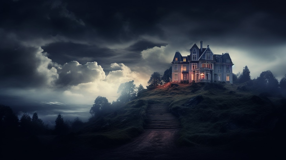 Создано на основе запроса: A mansion on a big hill. The sky is a little gloomy