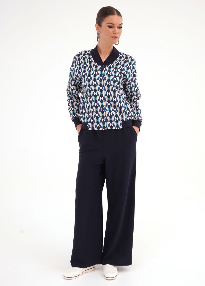 Стильный бомбер из необычной ткани. Последние размеры 44,46. Эффектные лёгкие темно-синие брюки, незаменимые в гардеробе. Размеры 42-54. Образ неотразимый.