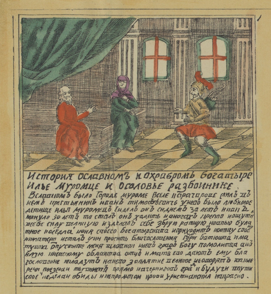 История о славном и о храбром богатыре Илье Муромце и о Соловье Разбойнике. В славном было городе Муроме в селе Карачарове жил в нем крестьянин Иван Тимофеевич, у него было любимое детище Илья Муромец. Сидел он сиднем 30 лет и как минуло 30 лет, то стал он ходить на ногах крепко и ощутил в себе силу великую и сделал себе сбрую ратную и копье булатное и оседлав коня своего богатырского и приходит ко отцу своему и ко матери и стал у ин просить Благословения, государи Батюшка и матушка отпустите меня в славный град Богу помолиться, князю киевскому ….. отец и мать его дают ему благословение, кладут на него заклятие великое… не оспорят такие речи поезжай ….. прямо на Чернигов град и будучи в пути своем не наделай обиды и не проливай крови христианской напросно. Илья Муромец принял у отца и матери благословение Богу молиться. Со отцом и матерью попрощался и поехал в путь свой, и так далеко заехал в темные леса, что неслыханы … разбойничий удел. Разбойники увидели Илью Муромца и разгорелись