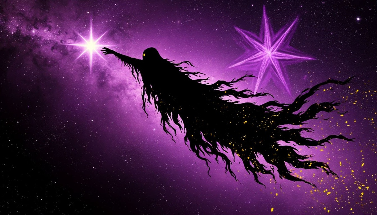 В мире, где небо никогда не знало солнца, а земля не помнила прикосновения света, жили Тени. Их царство раскинулось меж двух бездн: внизу — чёрные леса из окаменевшего дыма, вверху — мерцающая пелена, сквозь которую проглядывали звёзды. Не те звёзды, что знают люди. Эти были живыми, вечными, рождёнными в ином измерении, где материя — лишь отсвет души. Тень по имени Эребус скитался по краю пропасти, где земля обрывалась в пустоту. Его тело, сотканное из густого мрака, струилось, как чернильная дымка, принимая формы то зверя, то ветра. Но чаще всего Эребус замирал, глядя вверх. Там, за пеленой, висела Звезда. Она не имела имени, ибо в её мире имена были не нужны — свет говорил за себя. Её лучи пронзали туман, как серебряные нити, и Эребус ловил их кончиками своих бестелесных пальцев. Они встретились в ночь, когда пелена истончилась. Звезда спустилась ниже, чем обычно, её сияние окрасило туман в лиловые тона. Эребус, нарушив запрет старейшин, поднялся к самому краю мира Теней. Его г