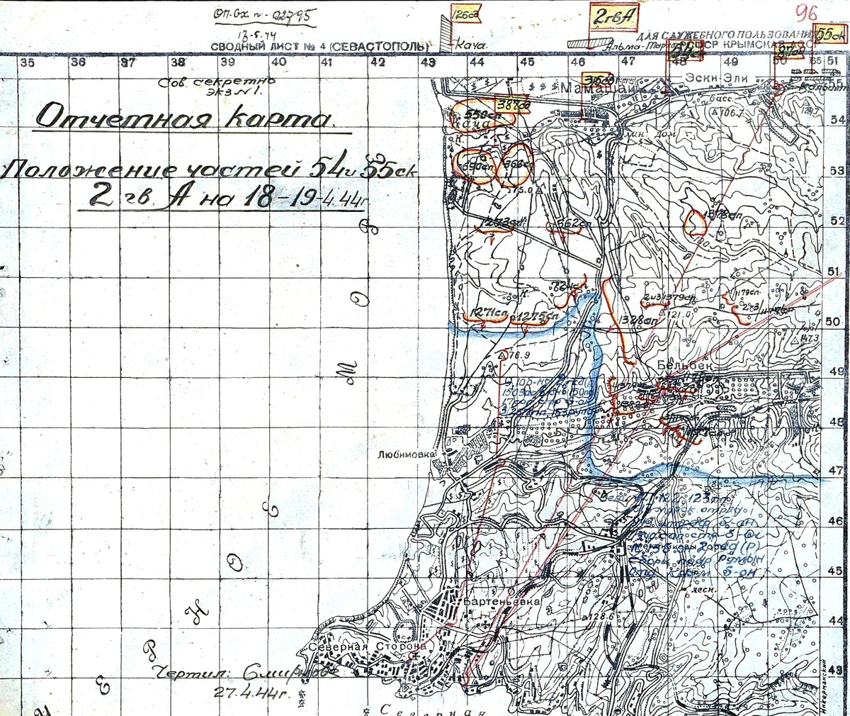 -16-й СК: 383-я сд западнее Кадыковка, юго-западнее Балаклавы, 227-я сд один сп западнее дороги от Балаклавы на юг, два сп в районе Алсу, 339-я сд во втором эшелоне корпуса в 2 км юго-западнее Комары. 255-я морская стрелковая бригада в районе Сахтик, 132-я гв. сд – район Куру- Узень, Туак, Сахтик.