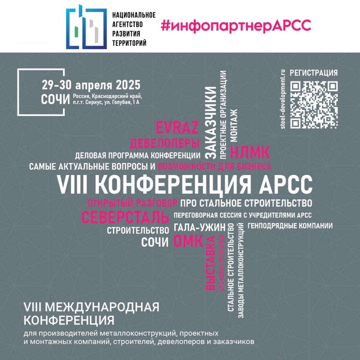 #инфопартнеры #VIIIКонференцияАРСС2025 📢 Продолжаем представлять информационных партнёров VIII Международной конференции АРСС по стальному строительству, которая состоится в Сочи 29-30 апреля 2025 года. ✅ Наше мероприятие освещает Национальное агентство развития территорий (НАРТ). Организация создана с целью улучшения качества городской среды, эстетики и архитектурного облика городов, реализации проектов комплексного развития, инвестиционных и индустриальных проектов. ❗️ Регистрация на конференцию закрывается 20 апреля. Успевайте занять последние места по ссылке.
