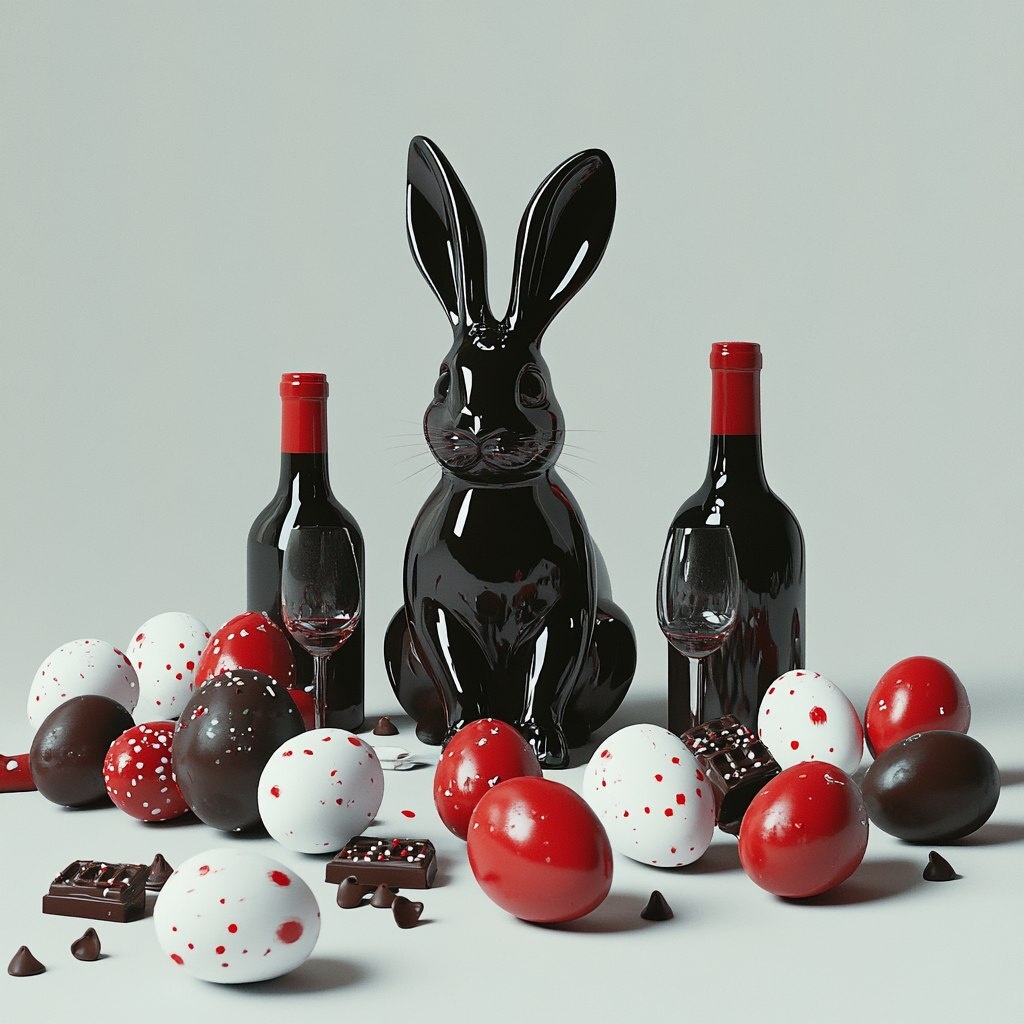 Создано на основе запроса: a easternet with a bunny in sourounded with winebottles and eggs and chocolate the chocolats are all eaten. the scene is realistic,modern, colours black,white, red. simple background --- Автоперевод: Восточный с кроликом в окружении винных бутылок и яиц и шоколада, шоколаты едят. Классно выглядит? 🤔 https://dzen.ru/id/65c0c65c86e4f837c27b24d7 #ИИ #AI #нейросеть #midjourney #art
