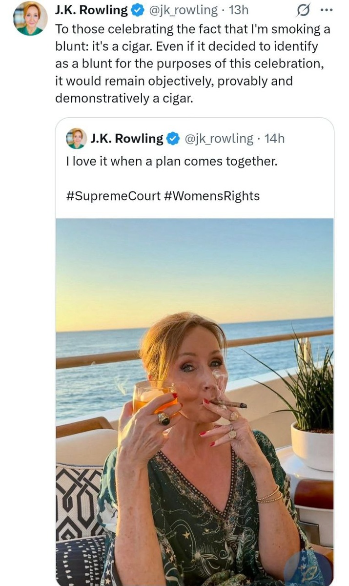 JK Rowling raises a glass to UK court's historic ruling that trans women are not legally women Is it a blunt, cigar, or blunt that identifies as a cigar? What's your toke? #UK