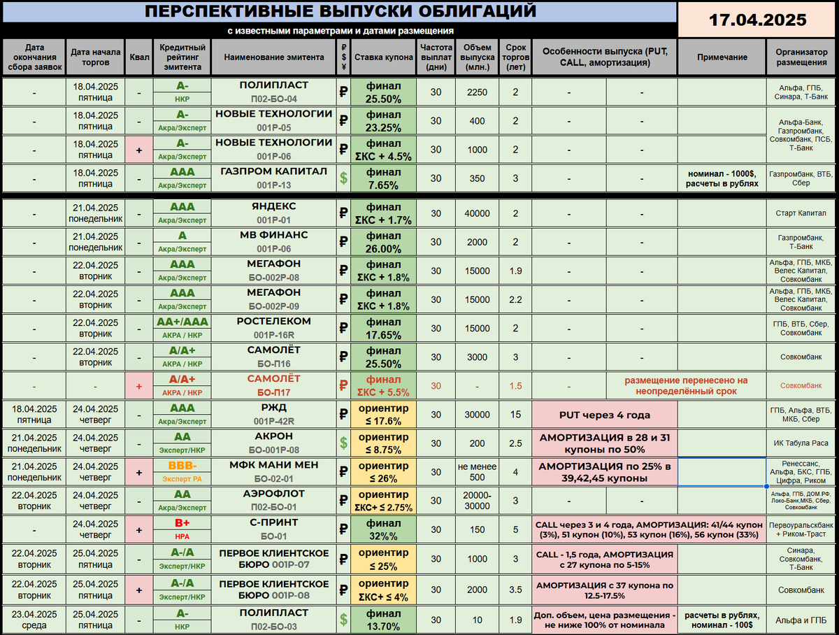 ---------- 🆕 НОВЫЕ РАЗМЕЩЕНИЯ / АНОНСЫ: 🌷 РЖД (🅰️🅰️🅰️) раскрывает интригу и делится стартовым купонным ориентиром выпуска 001Р-42R. Составит он, к сожалению или счастью, не выше 17,6%, сбор пройдет завтра. Напомню технические характеристики бумаги: 15 лет торгов, пут-оферта с пересмотром купона через 4 года, ежемесячные выплаты, 30 миллиардов планового объема. Торги начнутся 24 апреля, организаторы - ГПБ, ВТБ, МКБ, Сбер и Альфа. 🌷 Компания С-ПРИНТ (🅱️➕) занимается аутсорсингом печати. И решила пополнить оборотный капитал посредством выпуска БО-01, который будет предназначен только квалам. Объем составит
