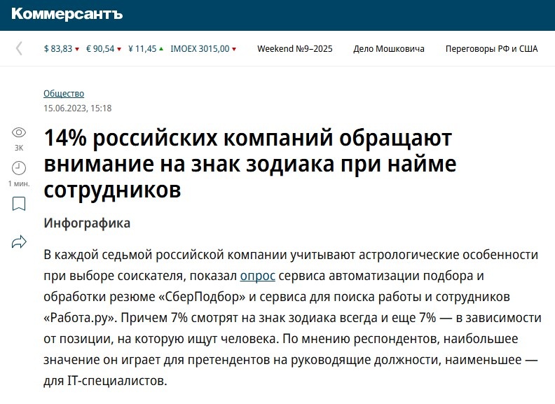 Представьте, что вы находитесь на распутье, листаете вакансии. Ваша трудовая книжка пуста или наполнена разношерстным опытом, но всё это объединяет одно - вы пытаетесь понять, кем хотите стать. Периодически в ленте попадается реклама сайтов, на которых вам предлагают узнать, какая профессия больше всего вам подходит по гороскопу. И вот ответ: «Ты же Овен - тебе в лидеры!». Звучит заманчиво, но что, если эти советы не просто бесполезны, а реально ломают карьеры и судьбы? Идея написать статью на тему астрологии в профессии у меня возникла после новости: человеку отказали в работе из-за его знака зодиака. Насколько это правдивая история - вопрос, но выяснилось, что это не редкость. Некоторые работодатели действительно обращают внимание на дату рождения соискателей. Разберем этот вопрос на двух примерах. 1. Выбор профессии по звездам. Человек хочет найти свой путь в жизни, но решает довериться гороскопам. В интернете легко найти советы: Рыбам быть художниками, Тельцам - бухгалтерами, Близн